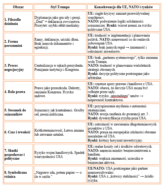 Również w tabeli można przedstawić skutki działań Trumpa dla relacji z UE, NATO i rynków finansowych.