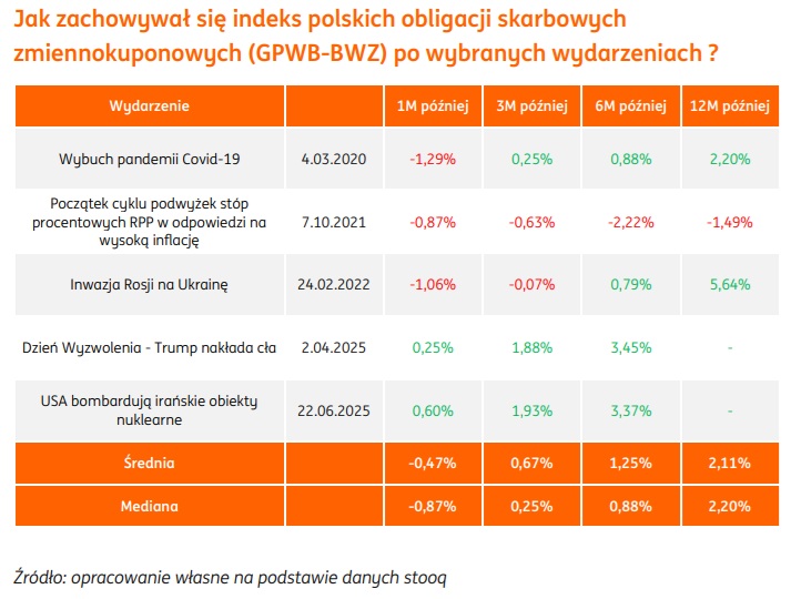 Jak zauważają analitycy ING, po szokowych wydarzeniach GPWB-BWZ średnio tracił w pierwszym miesiącu 0,47%, ale po 3, 6 i 12 miesiącach przechodził na plus odpowiednio +0,67%, +1,25% i +2,11%. Po inwazji Rosji na Ukrainę indeks ten był po miesiącu 1,06 proc. pod kreską, ale po sześciu miesiącach zyskiwał już 0,79 proc., a po roku był 5,64 proc. na plusie.