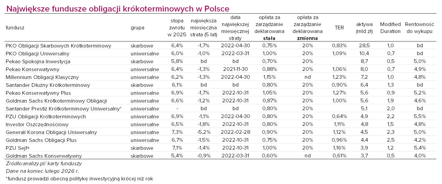 Wśród funduszy, które publikują te parametry w kartach, YTM mieści się obecnie w przedziale od 3,4 proc. (Goldman Sachs Konserwatywny Plus) do 5,53 proc., a modified duration od 0,1 do 2,48. Najwyższe YTM mają PZU Obligacji Krótkoterminowych (5,53 proc. przy duracji 2,16), PZU Sejf+ (5,35 proc. przy 1,19) oraz Pekao Konserwatywny Plus (5,2 proc. przy 0,86). Z kolei Pekao Spokojna Inwestycja (5,0 proc. przy 0,48) i Pekao Konserwatywny (4,9 proc. przy 0,67) pokazują, że część TFI utrzymuje relatywnie wysoką rentowność portfela przy niskiej wrażliwości na zmiany stóp. Trzeba jednak dodać, że część funduszy nie publikuje dziś YTM w kartach, więc porównanie jest niepełne.