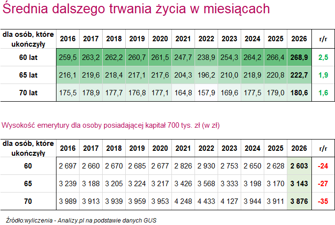 - 60-latka z kapitałem 700 tys. zł otrzyma emeryturę w wysokości 2603 zł, czyli mniej o ok. 24 zł (kapitał zostanie podzielony przez 268,9 zamiast przez 266,4 miesiąca).