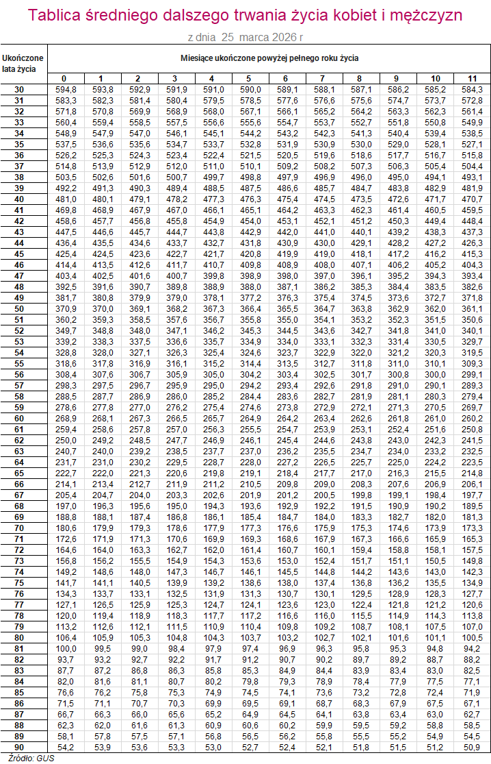 Główny Urząd Statystyczny opublikował nową tablicę dalszego trwania życia na podstawie danych o śmiertelności za 2025 rok. Dane są istotne dla osób przechodzących na emeryturę; tablica jest niezbędna przy wyliczaniu emerytury dla osób urodzonych po 1948 roku.