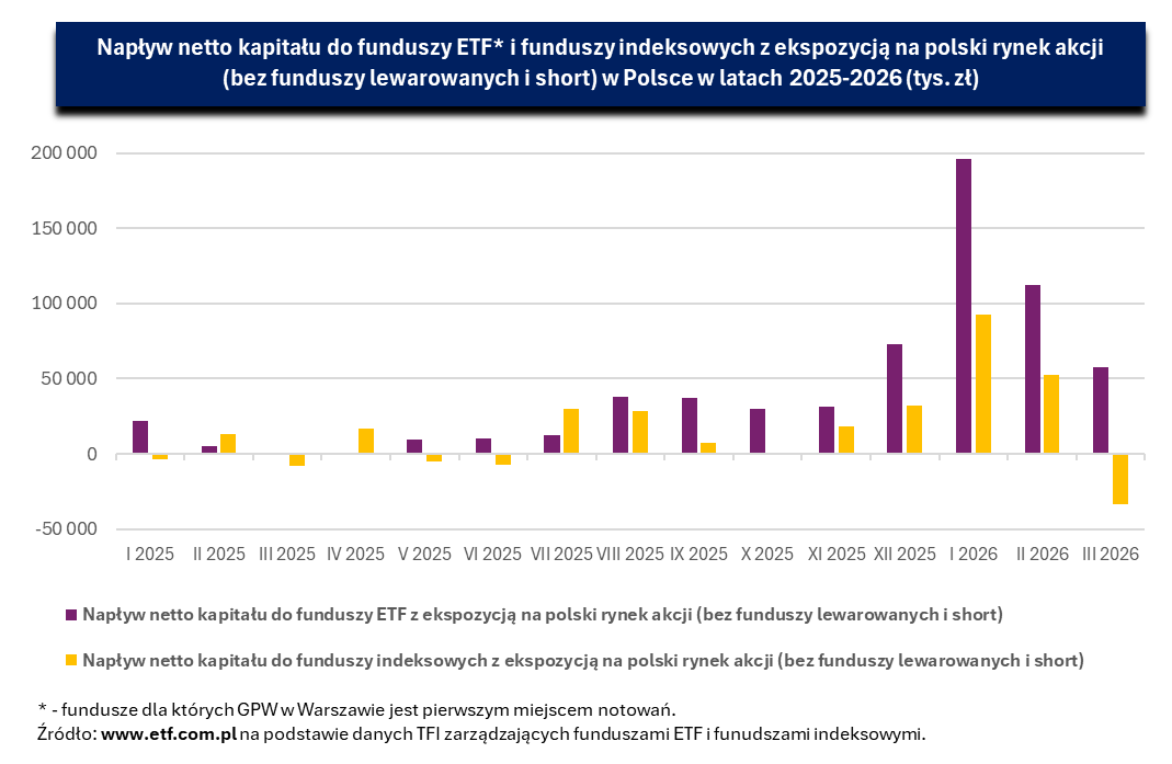 Marzec był kolejnym miesiącem, w którym – z uwagi na wybuch wojny w Zatoce Perskiej – nerwy i cierpliwość inwestorów giełdowych i uczestników funduszy inwestycyjnych lokujących kapitał w akcjach polskich spółek, zostały wystawione na próbę. Choć główne indeksy warszawskiej giełdy zakończyły miniony miesiąc tylko na stosunkowo niewielkich minusach (WIG20 zniżkował o 2,9%, a WIG o 3,4%), zmienność na krajowym rynku akcji była najwyższa od maja 2025 r.