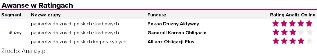 Wartą odnotowania poprawę kondycji zauważyliśmy także w przypadku Generali Korona Obligacje, gdzie wskaźniki efektywności zarządzania dla 12 oraz 36 miesięcy ustabilizowały się na poziomie 3a. Poprawa znalazła odzwierciedlenie w podwyżce Ratingu do poziomu 3 gwiazdek. Jeśli zaś chodzi o grupę produktu ukierunkowanych na krajowe obligacje korporacyjne, to pozytywnie oceniliśmy zmianę kondycji Allianz Obligacji Plus. Pod kątem efektywności zarządzania, mierzonej parametrem IR fundusz awansował na koniec marca do górnych 35% produktów w grupie (ranking cząstkowy 4a), jednocześnie utrzymując neutralną notę dla okresu 36 miesięcy oraz wysoką dla najdłuższego horyzontu analizy (górne 35%).