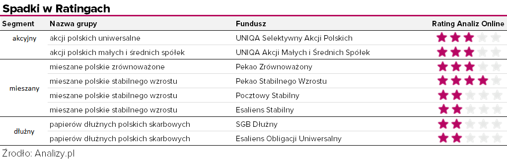 Oprócz dwóch przytoczonych już produktów z oferty UNIQA TFI z obniżką oceny przy tym przeglądzie Ratingów musiało się liczyć jeszcze 6 innych funduszy. Szczególnym przypadkiem w tym zestawieniu jest Pekao Stabilnego Wzrostu, który pożegnał się z utrzymywaną od września 2024 roku najwyższą oceną 5 gwiazdek. Zmiana wynika przede wszystkim z pogorszenia wskaźników efektywności zarzadzania. Chociaż w najdłuższym z okresów objętych analizą (tj. horyzoncie 5 lat) fundusz wciąż należy do 15% najlepszych rozwiązań w grupie, to jednak spadek efektywności w krótkim okresie jest wyraźny – do poziomu dolnych 35% produktów. Z podobną sytuacją mamy do czynienia również w przypadku Pekao Zrównoważony, gdzie ranking budowany w oparciu o parametr IR spadł na koniec marca do poziomu 2a.