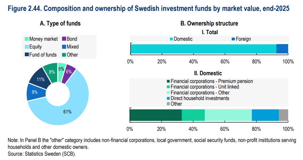 Szwedzki rynek funduszy jest jednym z filarów całego systemu. OECD wskazuje, że wartość ich aktywów wzrosła realnie 6,8 razy od 2012 r., czyli od momentu wprowadzenia ISK. Na koniec 2025 r. bezpośrednie inwestycje tych funduszy w akcje sięgały 6,2 bln koron, czyli ok. 570 mld euro. Fundusze akcyjne odpowiadały za 61% wartości rynku funduszy, a szwedzkie fundusze były znacznie mocniej zaangażowane w akcje notowane niż porównywalne rynki europejskie.