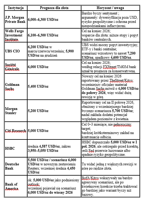 Największe instytucje są nadal w większości byczo nastawione do złota, ale zakres prognoz jest bardzo szeroki. Górny zakres to 6000–6300 USD/oz: J.P. Morgan, Wells Fargo, UBS i Société Générale. Środek rynku to mniej więcej 5000–5900 USD/oz: Goldman Sachs, Morgan Stanley, Citi i częściowo UBS na koniec roku. Bardziej ostrożne podejście mają HSBC i wcześniejsze prognozy Deutsche Banku, które zakładały średnie bliżej 4450–4600 USD/oz.